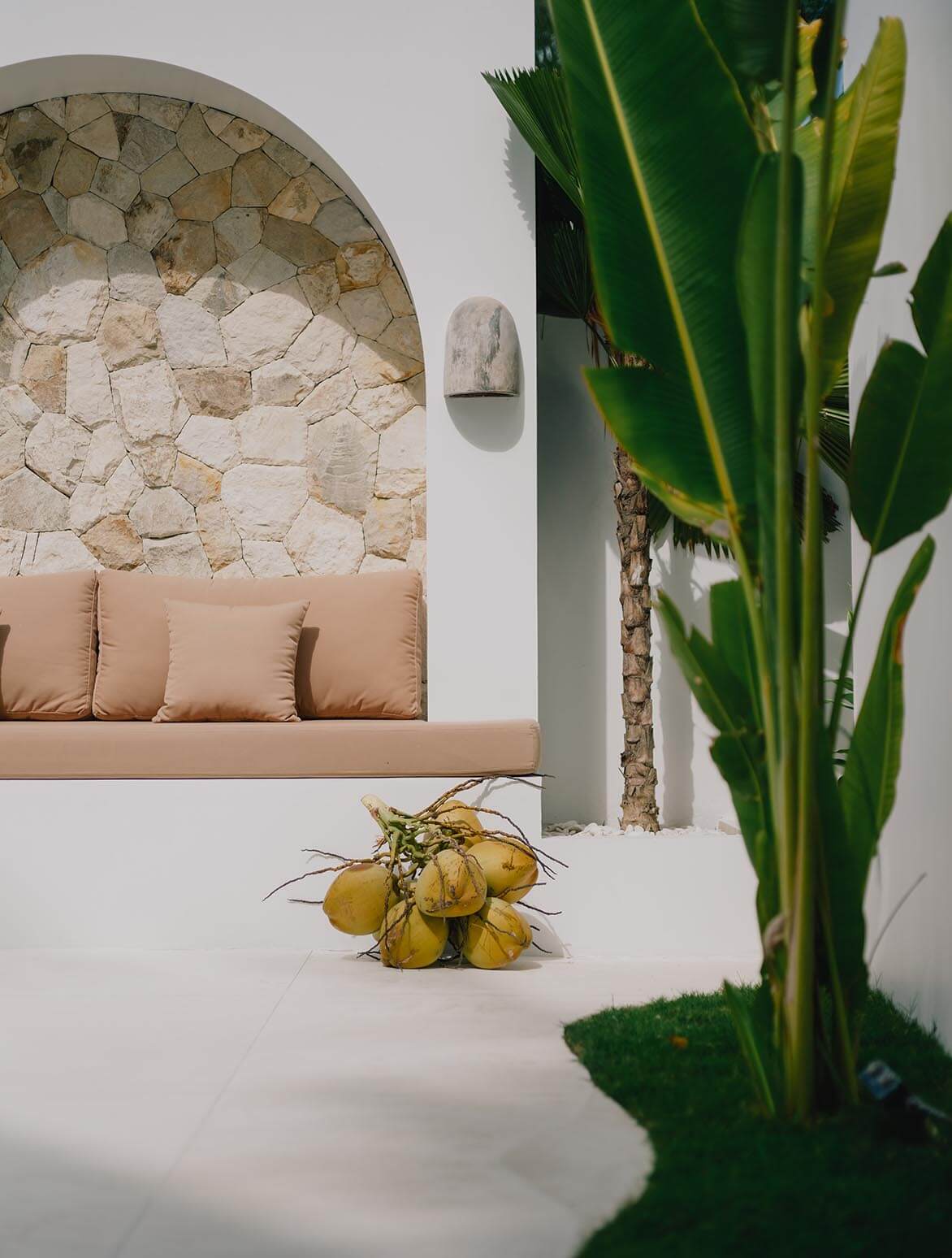 Water, vegetation and light shape every space. Sand-toned terrazzo floors — inspired by Lombok’s beaches and sometimes crafted with crushed shell elements — blend with natural stone, beige marble and raw wood.