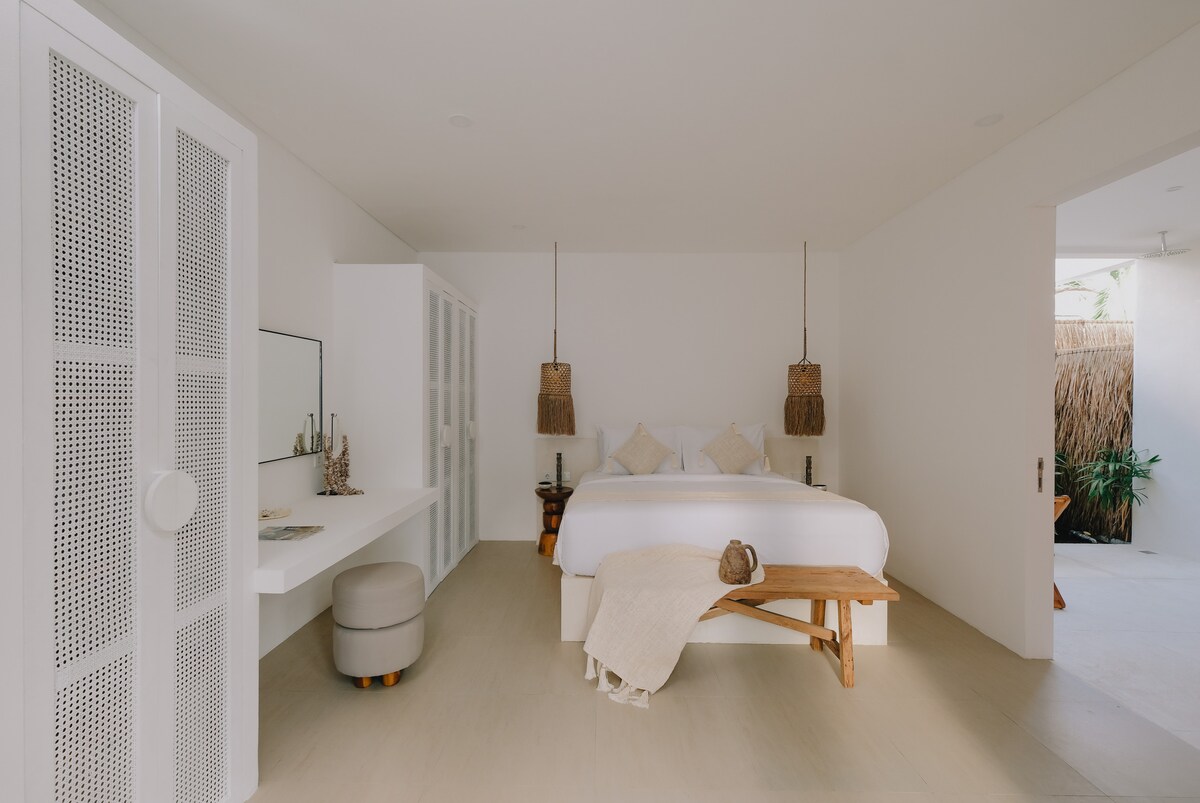 A 150 sqm tropical retreat designed for couples or solo travelers seeking privacy and atmosphere. The bedroom features a romantic canopy mosquito net and soft beige tones. Behind the sleeping area, a marble desk adds both elegance and practicality.